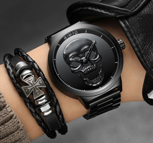 El reloj GIMTO Skull combina elegancia y rebeldía en un diseño único con calavera en relieve 3D. Fabricado en acero inoxidable, transmite poder, estilo y personalidad en cada detalle. Su acabado negro mate y maquinaria japonesa garantizan precisión, resistencia y presencia.